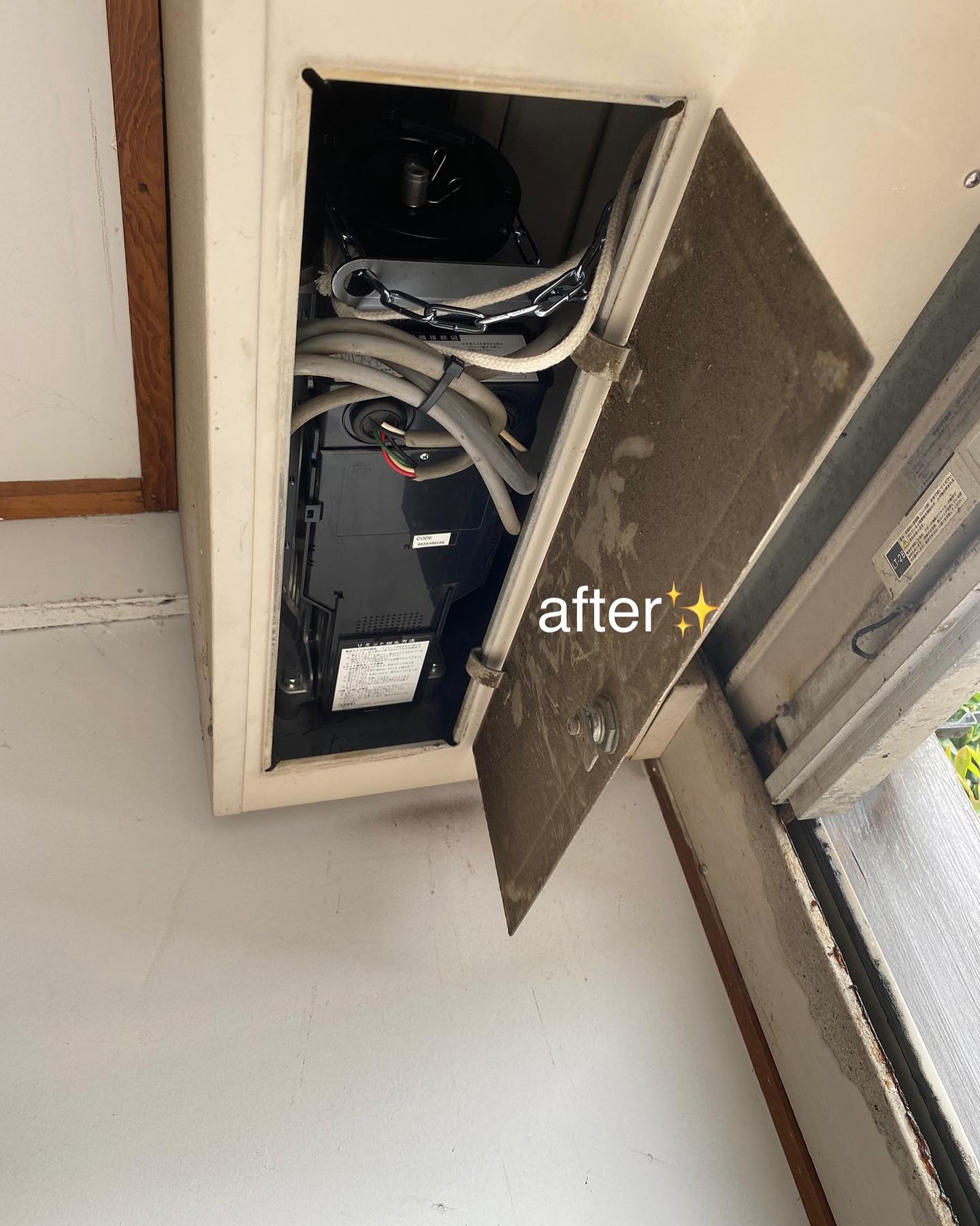 - シャッターが重く上げるのが大変だから何とかしてほしい。できれば電動にしたいと問い合わせがあり価格等相談をして三か所電動化させていただきました。<div>中柱も歪みと腐食が酷かったので一緒に交換させていただきました。</div>